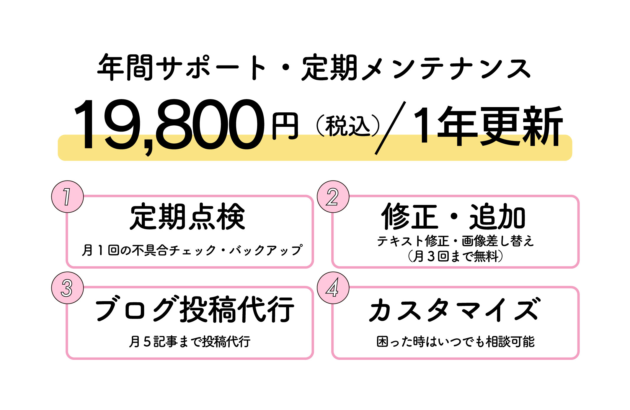 さらに、完成後も「不具合がないかの定期点検」や「ブログ投稿のサポート」など、Webが苦手な方でも安心して運用を続けられる「いつでも安心サポート」(※オプション)で、あなたの歩みを支え続けます。